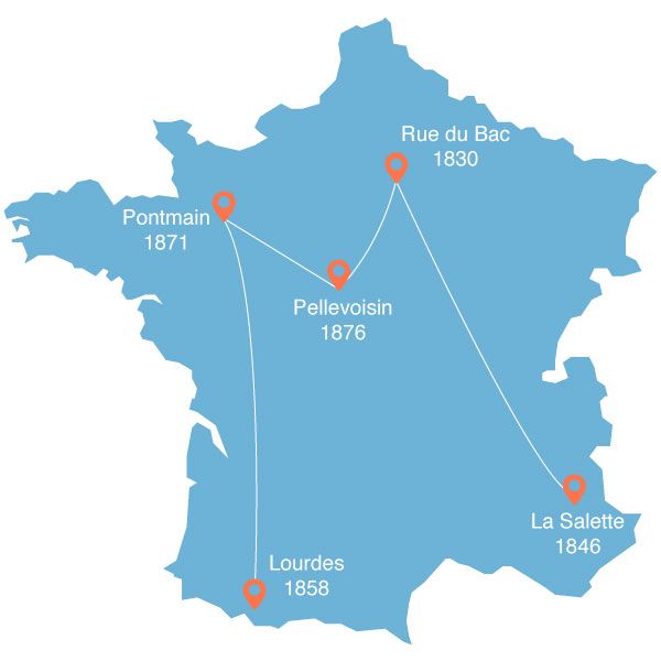 El siglo XIX fue testigo de una serie de apariciones marianas en todo el mundo, muchas de ellas en Europa. De las quince apariciones más o menos reconocidas por la Iglesia católica entre 1830 y 1933, cinco tuvieron lugar en territorio francés entre 1830 y 1876, en un periodo de 46 años. De estas cinco apariciones, tres fueron reconocidas oficialmente como «auténticas» por la Iglesia católica (La Salette, Lourdes y Pontmain), otras dos no han sido «reconocidas oficialmente», pero son objeto de un culto religioso ampliamente apoyado y fomentado por la Iglesia (la rue du Bac en París, con la medalla milagrosa y Pellevoisin con el escapulario del Sagrado Corazón).